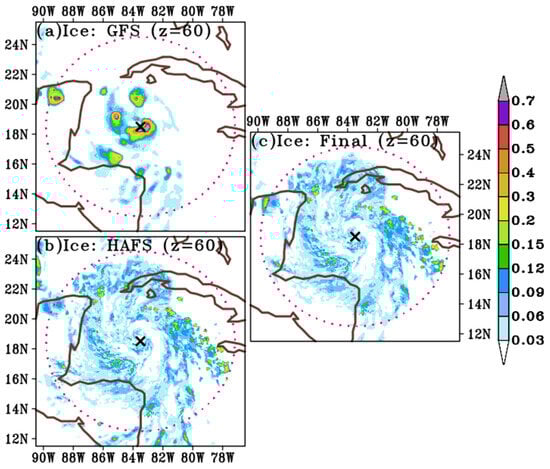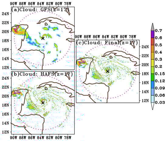 For the warm start, the cycle for hurricane Delta (26L 2020) at 1800 UTC on 6 October 2020 is shown as an example because the storm was at peak intensity with a maximum wind speed of 120 kt in the middle of the Caribbean Sea (Figure 4). In Figure 4a, the cloud ice associated with the cirrus cloud field exists within ~3 degrees in the GFS analysis. However, in the 6 h forecast results from the previous HAFS cycle, the model TC accompanies a broader cloud ice field, as observed for many other intense TCs (Figure 4b). Thus, the cloud ice pattern in Figure 4b appears more reasonable. This finding also justifies the selection of 6 degrees to relocate or cycle cloud variables; if the cloud were cycled or relocated in a smaller area (e.g., 3 degrees), the VI would miss the cloud ice information of the outer cirrus field of TCs. The cloud ice is close to the cirrus field, thus affecting the outgoing longwave radiation on the top of the cloud. This aspect could affect future DA if cloud radiance DA is used in HAFS; therefore, cloud ice must be handled carefully in VI. Figure 4c illustrates the final cloud ice field from the VI analysis. The GFS cloud ice variable within 6 degrees of the TC center is replaced by the 6 h HAFS forecast results from the previous cycle. The same cycling strategy is applied to low-level cloud water (Figure 5). In the GFS analysis, the eyewall convection of Delta is located to the east of the best track position (X mark in Figure 5a), but after the cycling of cloud variables, the eyewall convection moves to the correct position in the VI analysis (cf. Figure 5a,c). Interestingly, the 6 h HAFS forecast well reproduces the spiral rainband extending from the southern hemisphere of the TC to the Yucatan peninsula (Figure 5b).