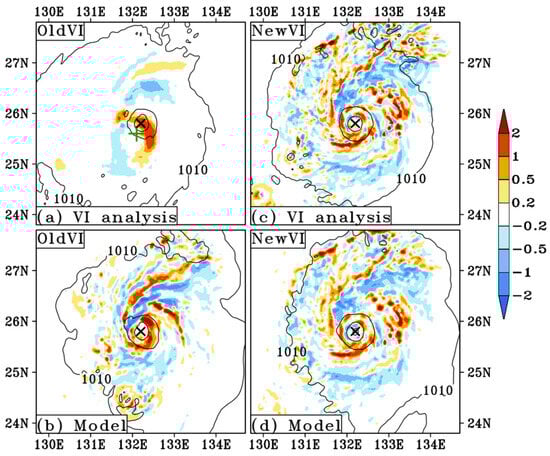 Figure 3 illustrates the cloud “relocation” for the cold start cycle of tropical depression 26L at 0600 UTC on 5 October 2020. Before the relocation procedure, the low-level GFS TC vortex center and its associated rainwater were located south of the best track position (red X) (Figure 3a,b). As shown in this example, in the GFS analysis, both the TC vortex and the cloud of the TC are not located in the observed positions, thus justifying the relocation of cloud variables. After VI, both the TC vortex and cloud hydrometeors are shifted to the correct positions in the VI analysis (Figure 3c,d). In the lower and upper levels, the cloud hydrometeor is situated east and northeast of the TC vortex circulation center, respectively, thus suggesting that the relocation was performed very well.