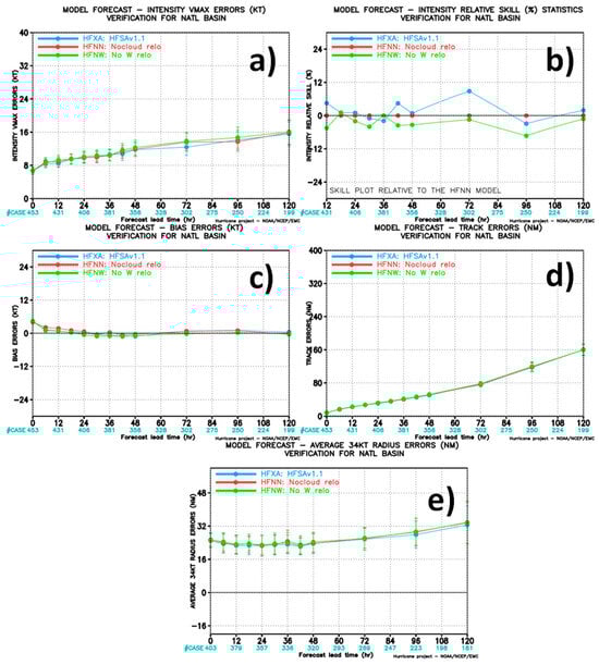 Statistics for (a) the maximum wind speed intensity error (unit: kt), (b) intensity relative skill with respect to the HFNN experiment (unit: %), (c) the wind bias (unit: kt), (d) the track error (unit: nm), and (e) 34 kt wind radius error (unit: nm).