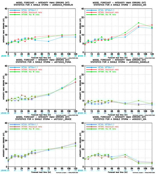 Figure 7a,b summarize the intensity forecast results from the three VI experiments. The HFXA experiment (i.e., HAFSv1.1) yields more encouraging results than the HFNN experiment, which shows that the relocation/cycling of cloud and vertical velocity does improve the overall intensity forecast of HAFS. Unexpectedly, the HFNW experiment, which only relocates or cycles cloud variables, yields somewhat poorer results than the HFNN experiment, which has no relocation/cycling capability for cloud and vertical velocity. This compelling result suggests the importance of vertical velocity in the HAFS intensity forecast. Further details are discussed in Section 5. The three VI experiments exhibit no difference in wind bias; thus, improving the cloud and vertical velocity in the model initial condition does not affect the wind bias (Figure 7c). Storm size and track error are also not significantly influenced by the new VI, as expected (Figure 7d,e). Because the cloud and vertical velocity fields in the storm region are only modified by this new VI, this change does not affect the large-scale flow that determines the storm motion. Figure 8 shows the performance of experiments for several examples of hurricane cases. Generally, the intensity error of the HFXA experiment is better than or similar to that of the HFNN experiment, except for Hurricane Ida. In addition, consistent with the findings in Figure 7, the HFNW experiment has a tendency toward greater intensity error than the HFXA or HFNN experiments.