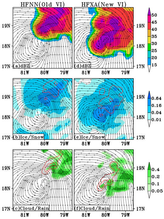 850 hPa streamline of the HFNN experiment model initial condition for the cycle of Tropical Storm Ida 09L at 0000 UTC on 27 August 2021 superimpose with (a) composite radar reflectivity (shaded: dBZ), (b) 300 hPa cloud ice mixing ratio (shaded: g kg−1), 450 hPa snow mixing ratio contoured at 1 g kg−1 intervals, (c) 600 hPa cloud water mixing ratio (shaded: g kg−1), 750 hPa rain water mixing ratio contoured at 1 g kg−1 intervals. (d–f) As in (a–c) except for the HFXA experiment.