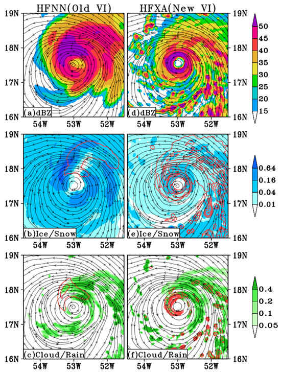 Figure 9 illustrates how the new VI improves the model initial condition for the cold start case of tropical storm Ida (2021 09L). According to the TCVitals, at 0000 UTC on 27 August 2021, Ida was a weak tropical storm with 35 kt intensity; thus, this cycle is a cold start in which the cloud is relocated in the GFS analysis. A high composite radar reflectivity region greater 15 dBZ covers the 850 hPa vortex center in the new VI (Figure 9d). This consistency between the radar reflectivity and the vortex circulation center is not found in the old VI because the relative locations of radar reflectivity and the vortex center in the old VI show that the vortex is only relocated, whereas the cloud field is not (cf. Figure 9a,d). The high radar reflectivity is mainly linked to precipitation particles like snow and rainwater (see Figure 9b,c,e,f). It is important to note that the distribution of 600 hPa cloud water and 700 hPa rainwater indicates that the cloud hydrometeors are not located near the 850 hPa vortex in the old VI, which seems unreasonable based on the patterns shown in Figure 9c,f.