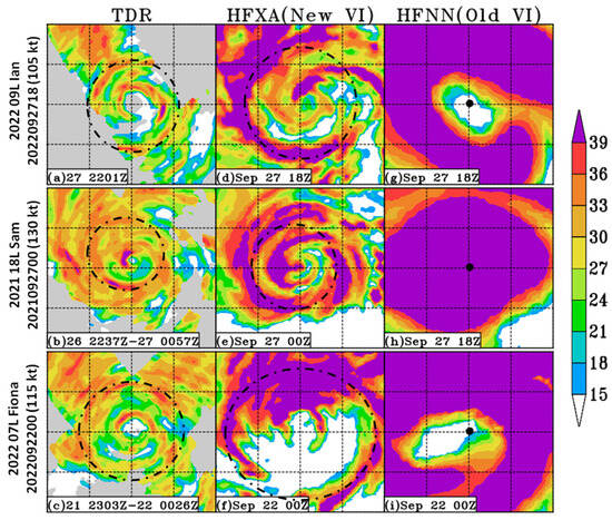 The 2 km level radar reflectivity (shaded: dBZ) from (a) TDR data at 2200 UTC on 27 September 2022 (Ian case), (b) TDR data averaged from 2237 UTC 26 to 0057 UTC on 27 September 2021 (Sam case), (c) TDR data averaged from 2203 UTC 21 to 0026 UTC on 22 September 2022 (Fiona case), the HFXA experiment initial condition for (d) the cycle 1800 UTC on 27 September 2022, (e) the cycle 0000 UTC on 27 September 2021, (f) the cycle 0000 UTC on 22 September 2022, and the HFNN experiment initial condition for (g) the cycle 1800 UTC on 27 September 2022, (h) the cycle 0000 UTC on 27 September 2021, (i) the cycle 0000 UTC on 22 September 2022. Domain coverage is 200 by 200 km with respect to the hurricane center, where the size of each box is 50 by 50 km. In (a–c), observed storm intensity is denoted in the left of each panel, and gray shading is the region where TDR data values do not exist. Dotted lines indicate the outer eyewall convection. The hurricane center is denoted as black circles in (g–i). TDR data are available at https://www.aoml.noaa.gov/ftp/pub/hrd/data/radar/level3/ (accessed on 7 July 2024).