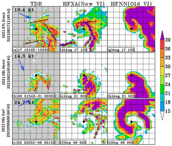The 2 km level radar reflectivity (shaded: dBZ) from (a) TDR data averaged from 1010 UTC to 1253 UTC on 17 August 2021 (Grace case), (b) TDR data averaged from 2154 UTC 20 to 0032 UTC on 21 August 2021 (Henri case), (c) TDR data averaged from 2225 UTC 05 to 0013 UTC on 6 September 2022 (Earl case), the HFXA experiment initial condition for (d) the cycle 1200 UTC on 17 August 2021, (e) the cycle 0000 UTC on 21 August 2021, (f) the cycle 0000 UTC on 6 September 2022, and the HFNN experiment initial condition for (g) the cycle 1200 UTC on 17 August 2021, (h) the cycle 0000 UTC on 21 August 2021, (i) the cycle 0000 UTC on 6 September 2022. Domain coverage is 400 by 400 km with respect to the hurricane center, where the size of each box is 50 by 50 km. The hurricane center is denoted as black circles. In (a–c), observed storm intensity is denoted in the left of each panel, and gray shading is the region where TDR data values do not exist. Vertical wind shear intensity (unit: kt) and direction (blue arrow) calculated from GFS analysis is shown in (a–c). TDR data are available at https://www.aoml.noaa.gov/ftp/pub/hrd/data/radar/level3/ (accessed on 7 July 2024).