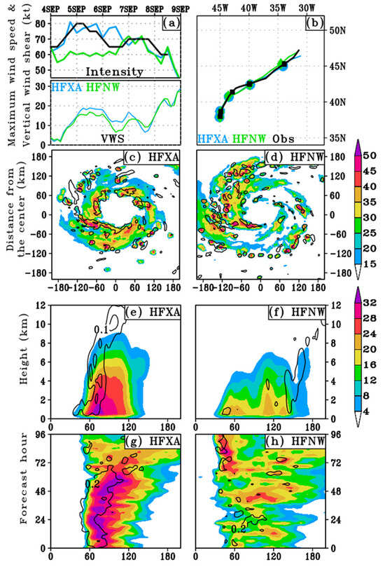 Figure 13a clearly shows that, unlike the HFXA experiment, which successfully predicts hurricane Danielle with an 80 kt intensity peak after 24 h, the HFNW experiment fails to capture the intensification of Hurricane Danielle during the first 24 h period. The vertical wind shear in these two experiments does not exhibit a noticeable difference because the storm tracks are similar in these experiments (Figure 13a,b). Similar tracks strongly indicate that the two storms in these experiments are under similar environmental conditions; therefore, the environment is not the main reason for the intensity forecast degradation in the HFNW experiment. Instead, the initial conditions of these two experiments show notable differences for the cycle of Danielle at 0000 UTC on 4 September 2022 (Figure 13c–f). The 2 km level radar reflectivity and updraft are more organized within a 100 km radius of the hurricane center in the HFXA experiment than the HFNW experiment, and strong convection and updraft exist primarily more than 100 km west of the hurricane center in the HFNW experiment (cf. Figure 13c,d). The azimuthally averaged radar reflectivity and updraft also illustrate that the storm is better organized in the initial condition of the HFXA experiment, which has a deeper updraft region along the eyewall of the hurricane (cf. Figure 13e,f). Because the hurricanes appear to be exposed to similar environmental conditions in these experiments, a different initial vortex may cause varied forecast results in the hurricanes experiments. The evolution of 2 km level radar reflectivity and updraft shows that the HFXA experiment already maintains a well-defined updraft region, where the vertical velocity is greater 0.2 m s−1, after the forecast is initiated (Figure 13g). However, the hurricane in the HFNW experiment fails to develop the updraft along in the eyewall during the first 60 h forecast period (Figure 13h). This different evolution of storm structure suggests that the initial vortex structure might explain why the HFXA experiment does not predict the intensity well for this cycle.