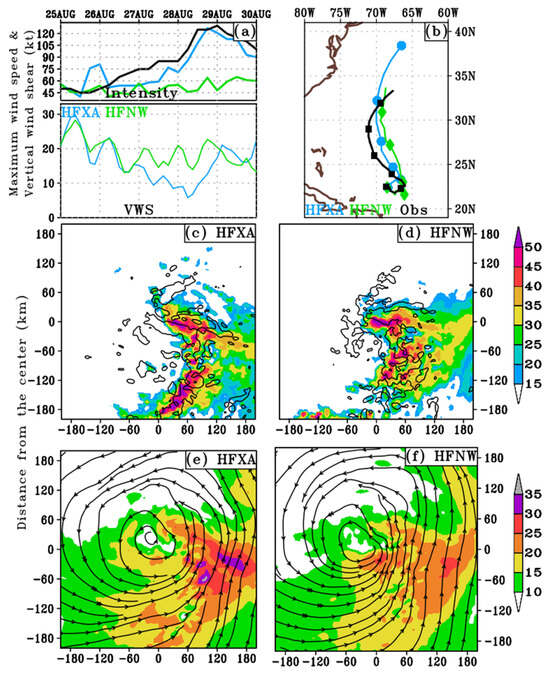 For the cycle of Franklin at 0000 UTC on 25 August 2023, the two experiments produce noticeably different intensity forecasts: the HFNW completely fails to predict the intensification of this hurricane after 0000 UTC on 27 August (i.e., after the 48 h forecast lead time) (Figure 14a). Unlike the cycle of Danielle at 0000 UTC on 4 September 2022 (Figure 13), the different environmental conditions between the two experiments play a role in the intensity forecast, because Figure 14a depicts that the strong vertical wind shear exceeding 20 kt during the first 24 h is not reduced in the HFNW experiment after 0000 UTC on 27 August. In addition, the tracks of these two experiments exhibit markedly different patterns during the first 72-h forecast, when the observed storm showed erratic movement (Figure 14b). The official NHC report for Franklin [36] stated that the upper-level trough, which was located to the north of the storm on 25 August, caused erratic movement of the storm, as shown in Figure 14b. Regarding the initial vortex structure, in the HFXA experiment, the storm vortex has slightly stronger convection to the south and stronger low-level winds to the east of the center compared to the HFNW experiment, although the differences are not large (cf. Figure 14c–f). For this cycle of Franklin, because the different vortex in the initial condition interacts with the environment (e.g., upper-level trough), the two experiments predict different tracks. Thus, a different initial vortex structure and its interaction with the environment likely cause the difference in the forecast of Franklin. As the storm moves differently in the two experiments, the storm in the HFXA experiment is influenced by more favorable conditions for development, such as low vertical wind shear, compared to the HFNW experiment.