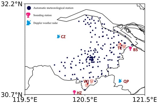 The data used in this paper include (1) the fifth-generation global atmospheric reanalysis data ERA5 (ECMWF Reanalysis v5) released by the European Centre for Medium-Range Weather Forecasts (ECMWF), with a spatial resolution of 0.1 × 0.1° and a temporal resolution of 1 h; (2) the minute precipitation, temperature, and 2 min mean wind direction and speed (Figure 1) of the automatic stations within Jiangsu Province from 00:00 to 12:00 on 6 July 2020; (3) the Doppler weather radar data of Changzhou (CZ) and Qingpu (QP) from 00:00 to 12:00 on 6 July 2020; (4) the wind profile data of Taicang (TC) and Wujiang (WJ) from 00:00 to 12:00 on 6 July 2020; and (5) the microwave radiometer data of Kunshan (KS) from 00:00 to 12:00 on 6 July 2020.
