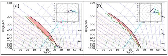 Sounding at Hangzhou Station at 08:00 on 14 May (a); sounding at Baoshan Station at 08:00 on 6 July (b).