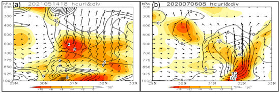 Vorticity and divergence profiles along 120° E at 18:00 on 14 May (a) and 08:00 on 6 July (b) (contour lines represent vorticity, shaded areas indicate divergence, unit: 10−5·s−1) (vector arrows represent zonal wind–vertical velocity composition, with vertical velocity magnified by 10 times).
