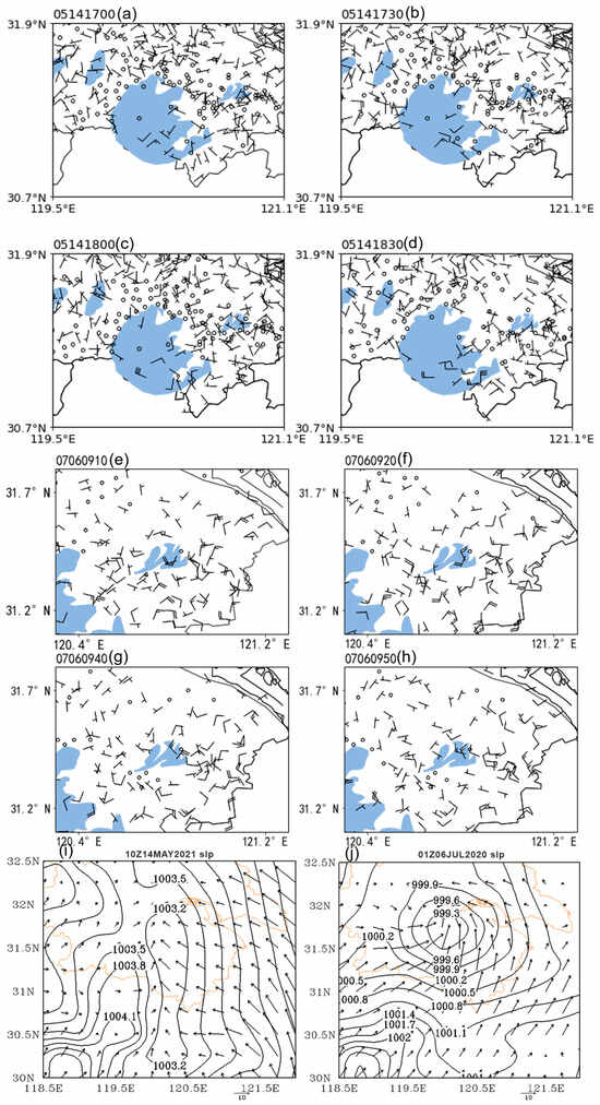 Wind field of Jiangsu surface automatic stations at 17:00 (a), 17:30 (b), 18:00 (c), 18:30 (d) on 14 May; 09:10 (e), 09:20 (f), 09:40 (g), 09:50 (h) on 6 July (blue shaded area represents Taihu Lake); pressure and wind field on the ground at 18:00 BT on 14 May 2021 (i) and 09:00 BT on 6 July 2020 (j). The contour lines and arrows in (i,j) represent the surface pressure and wind vector at 2m, respectively.