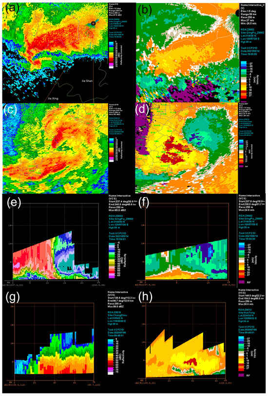 The 1.5° elevation basic reflectivity factor (a), 1.5° elevation radial velocity (b), reflectivity factor profile (e), and radial velocity profile (f) at 19:00 BT of Qingpu Radar Station on 14 May 2021; 1.5° elevation basic reflectivity factor (c), 1.5° elevation radial velocity (d), reflectivity factor profile (g), and radial velocity profile (h) at 9:48 BT of Changzhou Radar Station on 6 July 2020.