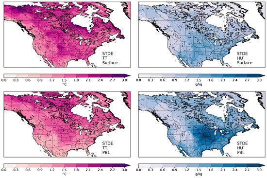 Maps over North America of NEW’s STDEs at screen level (upper panels) and at hybrid level (lower panels) for air temperature (K, with red shading, on the left) and for specific humidity (g kg−1, with blue shading, on the right). Forecast errors are temporally averaged for summer 2019 forecasts valid between 78 h and 144 h based on model outputs and analyses every 6 h, i.e., at 0000 UTC, 0600 UTC, 1200 UTC, and 1800 UTC.