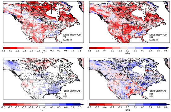 Maps of the STDE differences between NEW and OP for the same period and forecast ranges are shown in Figure 2, both at the surface and at level . Forecast error differences are temporally averaged for summer 2019 forecasts valid between 78 h and 144 h based on model outputs and analyses every 6 h. The results at the screen level (Figure 2’s upper panels) are consistent with [19]. For screen-level air temperature, the STDE is generally smaller with NEW compared to OP. The largest impact is found over Canada’s northern areas, but the air temperature STDE is also decreased at the screen level over the US’s western and central regions. There is a smaller increase in STDE with NEW over the southeastern US and southern Canada. For specific humidity, the spatial patterns for STDE differences between the two experiments at the screen level are similar to those for air temperature, with a substantial error decrease over northern areas and the western-central US and an STDE increase over the southeastern US.