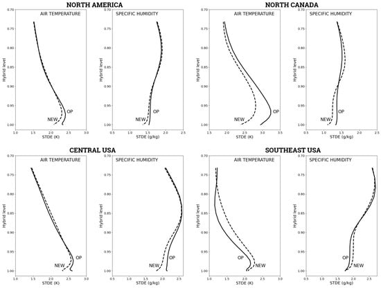 Vertical profiles of STDE errors for air temperature (K) and specific humidity (g kg−1) spatially averaged over the land portion of North America and of the specific areas depicted by rectangles in Figure 2 for northern Canada, the central US, and the southeast US. Results are shown for the NEW (dashed lines) and OP (full lines) experiments. The profiles are temporally averaged for the forecasts valid at 0000 UTC, 0600 UTC, 1200 UTC, and 1800 UTC for ranges between 78 h and 144 h (i.e., forecasts for days 4 to 6). The model’s hybrid levels are used as vertical coordinates.