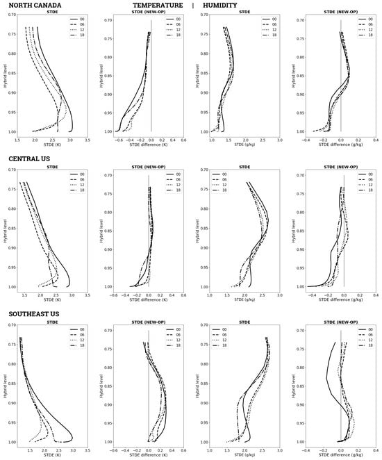 For northern Canada, the air temperature STDE differences (in favor of NEW for that domain) are amplified and deepen vertically throughout the day, as shown by the progression from 1200 UTC (morning) to 1800 UTC (afternoon) to 0000 UTC (evening). For the central US domain, the vertical profiles indicate a reduction in air temperature STDE in the lowest 500 m or so (below level ) with a slight deterioration above. The error differences at low levels increase in vertical depth in the morning, from 1200 UTC to 1800 UTC, followed by a decrease late in the afternoon or early evening, from 1800 UTC to 0000 UTC. For the southeastern US, the air temperature STDE differences are in favor of OP and appear to decrease between 1200 UTC and 1800 UTC and then substantially increase between 1800 UTC and 0000 UTC, with a slight decrease after that (late evening, early night).
