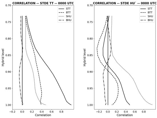 The diagrams shown in Figure 6 provide a summary of the statistical links between screen-level errors and the STDE at level , which is approximately 1.5 km above the surface and could be considered to be in the upper portion of the boundary layer. The correlations displayed in the upper panel of that figure are obtained for the North American domain and are used here to determine whether errors at for the three domains are consistent with the behavior previously described. The results in this section are only discussed for 0000 UTC, in the late afternoon and evening for North America, when the STDE is largest in the lower troposphere (see Figure 4).