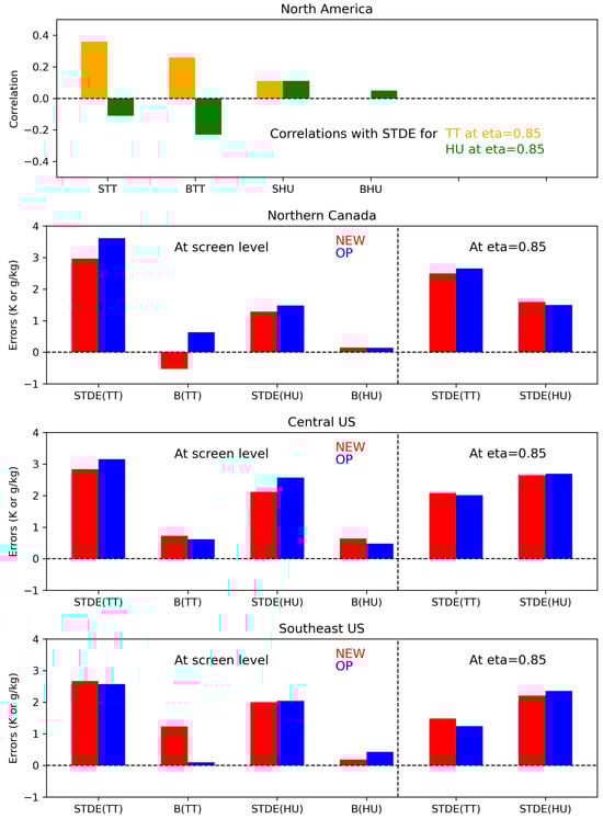 The upper panel provides histograms showing the statistical relationship between screen-level errors (STDE and bias) and the STDE at level for the North American domain (in yellow for air temperature and in green for specific humidity). The lower three panels show the STDEs and biases for air temperature and specific humidity at the screen level and the STDEs at for the three subdomains indicated by the black rectangles in Figure 2. The results for NEW are in red, whereas the results for OP are in blue. In the legends, “B” refers to bias, while “TT” and “HU” refer to air temperature and specific humidity.