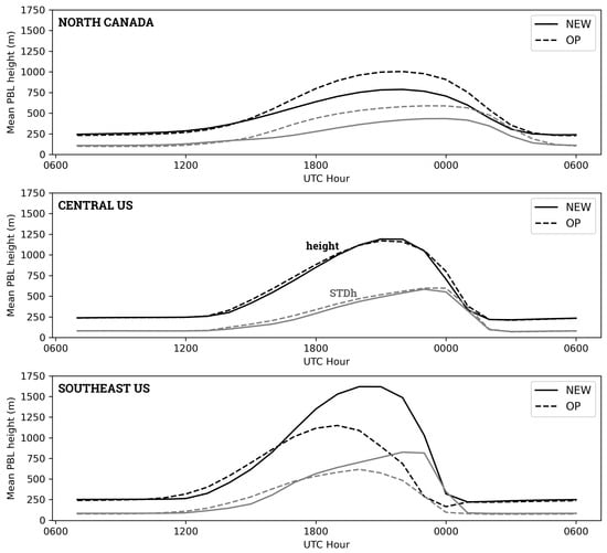 Over northern Canada (Figure 7’s upper panel), the maximum PBL height is on the order of 750 m for NEW and 1000 m for OP, with a spatial variability that is also substantially larger for OP, i.e., close to 500 m for OP compared with 350–400 m for NEW. For both experiments, the PBL is most developed for a few hours before 0000 UTC, while the spatial variability is largest just after 0000 UTC. Going directly to Figure 7’s lower panel, the situation is reversed for the southeast US, where the PBL is substantially deeper for NEW, with peak values greater than 1500 m around 2100 UTC, compared with a maximum PBL height of about 1000 m for OP, peaking a few hours earlier than NEW (i.e., just after 1800 UTC). Differences are also found for the spatial variability, which is close to 750 m for NEW just before 0000 UTC, compared with a standard deviation of about 500 m, peaking around 2000 UTC for OP. In contrast, the PBL appears to evolve in a similar manner for the central US domain (Figure 7’s middle panel), with a maximum PBL depth slightly greater than 1000 m around 2100 UTC and a maximum standard deviation of about 500 m near 0000 UTC.