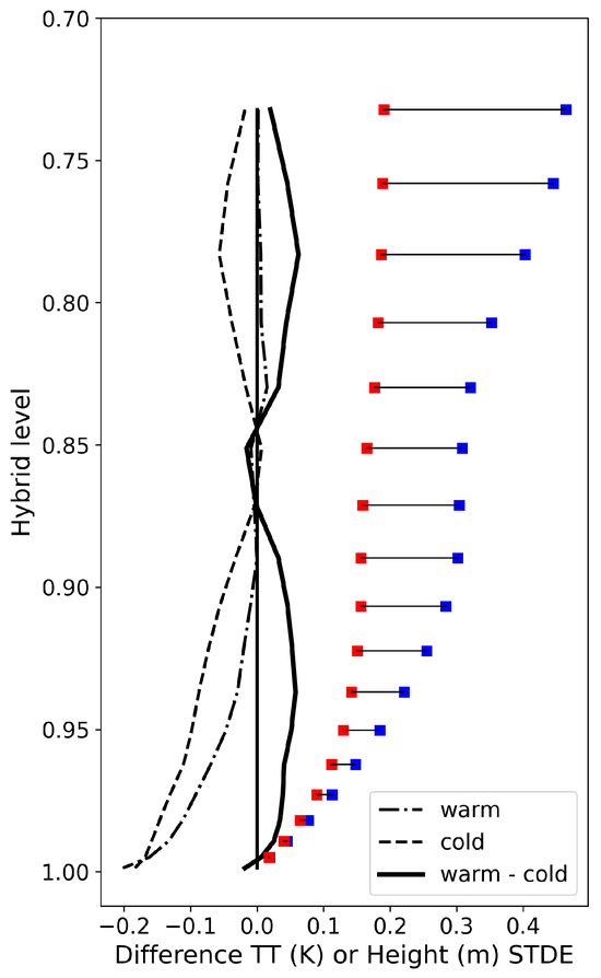 Vertical profiles of air temperature STDE differences between NEW and OP (NEW minus OP) for land surface points selected between the 20th and 30th percentiles (“cold” in the figure) and the 70th and 80th percentiles (“warm” in the figure) of the spatial distribution of air temperature bias differences between NEW and OP at the screen level. These distributions are over the land portion of North America for forecasts valid at the 96 h, 120 h, and 144 h ranges. The blue and red squares represent the differences in height differential errors (m) based on Equation (9) for the “cold” (blue) and “warm” (red) vertical profiles.