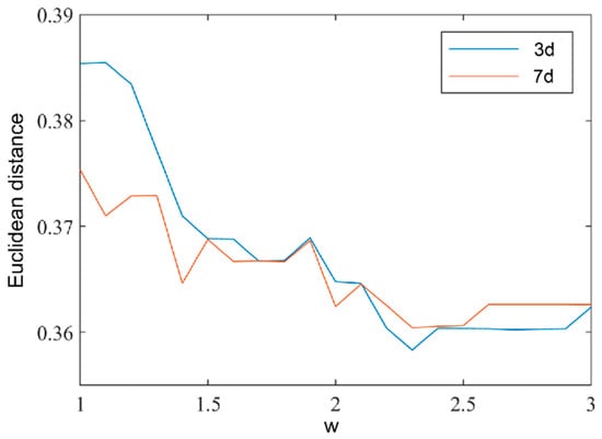 To determine the optimal parameters, this study used CHIRPS rainfall data from 1981 to 2018 for calibration and validation. By combining different values of t and w, we generated the antecedent effective rainfall index (ARI) series for 1981–2018. Since most landslide records are from 2008–2018, we used the 95th percentile of ARI from 1981–2007 as the historical threshold. Landslide data from the GLC database and 5000 additional non-landslide time-location points were selected, with 80% used for calibration and 20% for validation (validation results in Section 4.2). We calculated the ARI for each event under different parameters and used its exceedance of the historical threshold to predict landslides. The optimal t and w were determined by the Euclidean distance with the detailed calculation described in Section 3.3. The parameter calibration results are shown in Figure 2. The Euclidean distance decreases sharply with increasing w, with the 3-day ARI significantly larger than the 7-day ARI. Beyond w = 2, the decrease stabilizes, and the 3-day ARI’s Euclidean distance becomes smaller than the 7-day ARI. At w = 2.3, the 3-day ARI’s Euclidean distance is minimized to 0.3583, making 3 days and 2.3 the optimal combination.