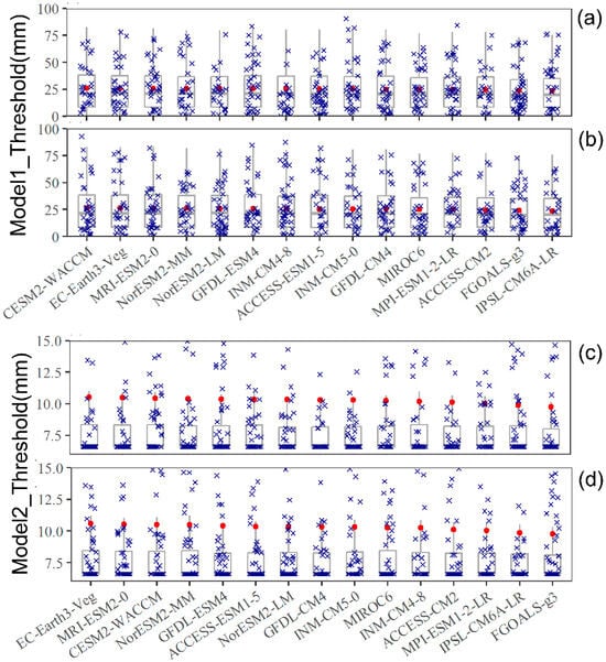 Thresholds of MODEL 1 and MODEL 2 under different climate models (red dots represent average values), (a) The thresholds of MODEL 1 under the QDM correction algorithm; (b) The thresholds of MODEL 1 under the MBCn correction algorithm; (c) The thresholds of MODEL 2 under the QDM correction algorithm; (d) The thresholds of MODEL 2 under the MBCn correction algorithm.