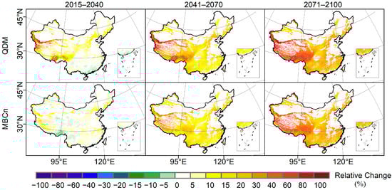 The landslide-risk predictions using the QDM and MBCn bias-correction algorithms were averaged to determine the spatiotemporal changes in landslide risk under different correction methods (Figure 6). Comparing the results, it is evident that the QDM algorithm predicts a higher increase in future landslide risk in China than the MBCn algorithm. In the early 21st century, only a small area shows a decreasing trend under the QDM algorithm, while over half of the regions show a decreasing trend under the MBCn algorithm, with the most significant decrease in the Qinghai–Tibet Plateau. Over time, landslide risk in the Eastern region increases significantly under both algorithms. However, in areas bordering the Qinghai–Tibet Plateau and the Northwest, the increase under the QDM algorithm exceeds 80%, while under the MBCn algorithm it is about 20% to 60%. Additionally, in the Eastern Qinghai–Tibet Plateau, the decrease in landslide risk and the extent of this decrease are much greater under the MBCn algorithm than under the QDM algorithm. The results of the two bias-correction algorithms do not show significant differences; therefore, the subsequent analysis in this paper is based on the average of both algorithms.