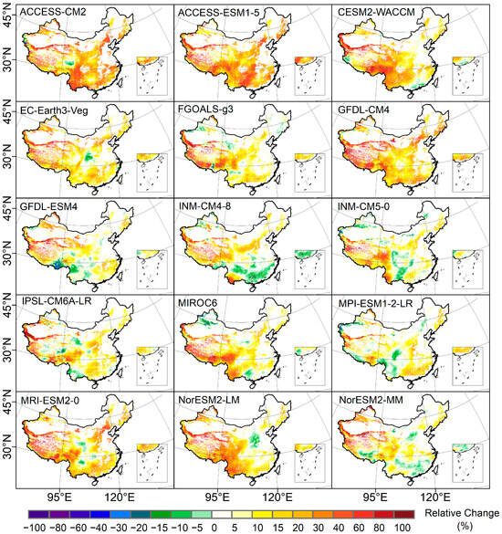 Spatial distribution of relative changes in rainfall-induced landslides in China from 2041 to 2070 under different climate models in the SSP2-4.5 scenario.