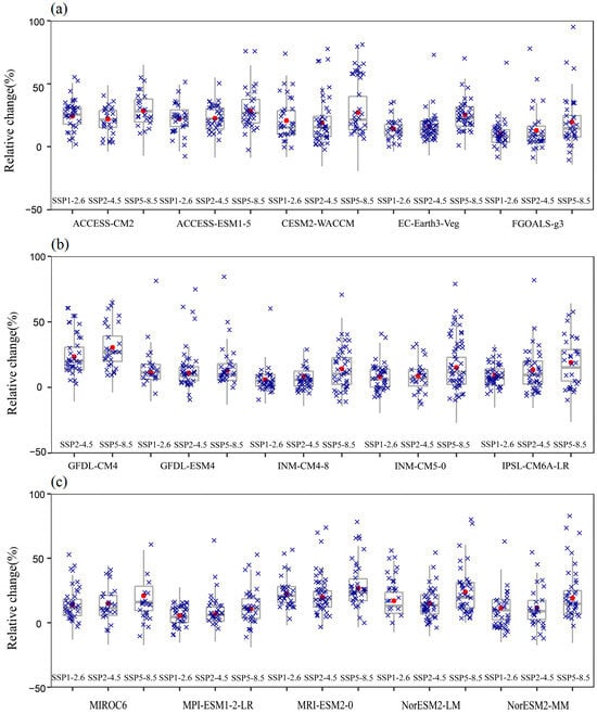 Relative changes in landslide risk under different SSPs across various climate models (red dots represent average values), (a) GCMs include ACCESS-CM2, ACCESS-ESM1-5, CESM2-WACCM, EC-Earth3-Veg, and FGOALS-g3; (b) GCMs include GFDL-CM4, GFDL-ESM4, INM-CM4-8, INM-CM5-0, and IPSL-CM6A-LR; (c) GCMs include MIROC6, MPI-ESM1-2-LR, MRI-ESM2-0, NorESM2-LM, and NorESM2-MM.