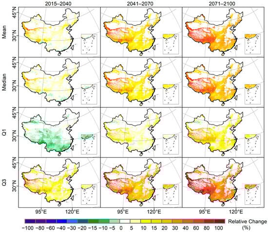 Spatial distribution of relative changes in rainfall-induced landslides in China across different future periods.