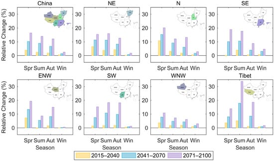 Figure 12 illustrates the average changes in landslide risk relative to the reference period for each region across different seasons and time periods. Overall, landslide risk increases most significantly in spring and summer, with all regions generally seeing increases exceeding 10% during 2071–2100. The spring increases are particularly notable in the Southeast (SE), North (N), and Eastern Northwest (ENW) regions, reaching about 20%. Summer and autumn show relatively smaller increases, but still over 10% in most regions, with the highest summer increases in the Qinghai–Tibet Plateau (Tibet). Winter exhibits the smallest changes, with most regions having increases below 10%. In the early 21st century (2011–2040), the Southeast (SE) and Eastern Northwest (ENW) regions show a slight decreasing trend in landslide risk, generally less than 3%. However, over time, particularly in the late 21st century (2071–2100), landslide risk in these regions generally increases significantly.