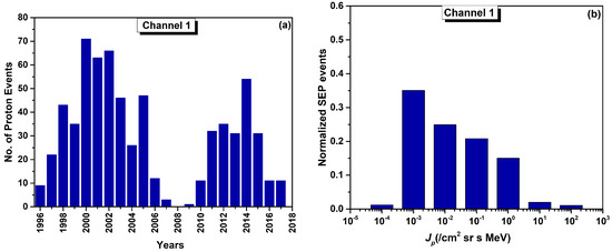 Yearly distribution (a) and intensity distribution (b) for the first energy channel of the SOHO/ERNE SEP events.