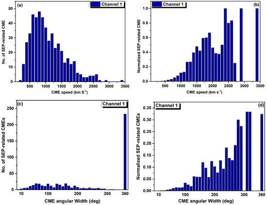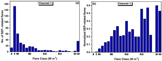 The histograms of the SEP-associated SFs and CMEs are shown in Figure 2 and Figure 3, respectively, for the total and normalized numbers. The event distributions represent cases observed in both SCs, amounting to 425 SEP-associated SFs and 511 SEP-associated CMEs (for the first energy channel of 659 SEPs). The normalization is conducted as described in [15]. Namely, each bin from Figure 2a is divided by the number of all observed SFs in the respective range of SXR class giving the bin seen in Figure 2b. For example, the total number of SEP-associated SFs of the C-class is 153, which is the majority of SEP-associated SFs. For the normalized value, this number is divided into all C-class flares observed in SC23+24 (around 21,000) leading finally to an insignificantly small normalized number in the same bin. In contrast, over the same time period, the SEP-associated SFs larger than X2 are 36; however, the entire number of observed >X2 is 69, leading to the result that 52% of all >X2 SFs are accompanied by an SEP event.
