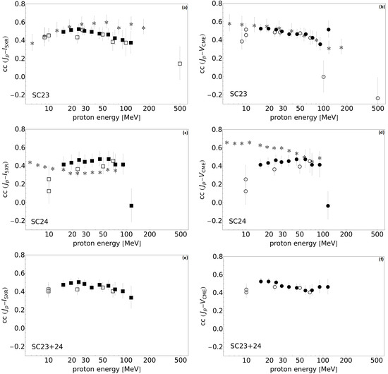 Energy dependence correlations of (a) and (b) for SC23, SC24 (c,d) and SC23+24 (e,f), respectively. Filled symbols are used for HED channels, empty symbols for the remaining channels in Table 1; with stars are noted the results from [36] in SC23 and from [30] in SC24.