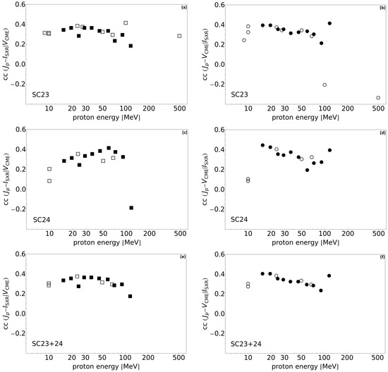 Energy dependence correlations of (a) and (b) for SC23, SC24 (c,d) and SC23+24 (e,f), respectively. Filled symbols are used for HED channels, empty symbols for the remaining channels in Table 1.