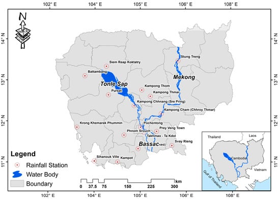 The Kingdom of Cambodia, a country in Southeast Asia (Figure 1), is located on the southern tip of the Indochina Peninsula. Specifically, it is located in the tropical region lying between latitudes 10° N and 15° N and longitudes 102° E and 108° E. Approximately 181,035 km2 (69,898 sq mi) in total, it is bordered by Vietnam, Laos, Thailand, and the Gulf of Thailand. The tropical Indomalaya area and the Indochina Time Zone (ICT) include the entire country. With tropical monsoons, Cambodia’s climate shows distinctive wet and dry seasons, a wet season (from May to October) and a dry season (from November to April). It is observed that September and October are the wettest months with between 70% and 80% of the yearly precipitation, while January and February are the driest months with between 10% and 20% of the total rainfall [17]. One of the world’s largest tropical rivers is the Mekong. When the Mekong River floods, the water backs up into the Tonle Sap River, changing the direction of the river’s flow [18]. The Tonle Sap and Bassac Rivers meet the Mekong to form the Chaktomuk confluence, which is home to Phnom Penh, the capital of Cambodia [19]. Southeast Asia’s largest inland lake, Tonle Sap Lake, is home to rare habitats and species that have adapted to seasonal variations. A floodplain encircles the lake’s permanently flooded region, and, from May to October, the upper Mekong River experiences monsoon rains [20].