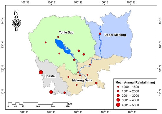 Mean annual rainfall data at each station in Cambodia (1991–2021).