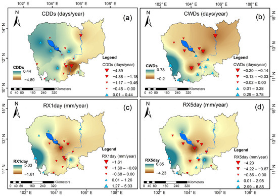 The spatial interpolation of the trends of the extreme rainfall indices in Cambodia: (a) CDDs, (b) CWDs, (c) RX1day, and (d) RX5day. The filled red downward and filled blue inverted triangles indicate decreasing and increasing trends, respectively.