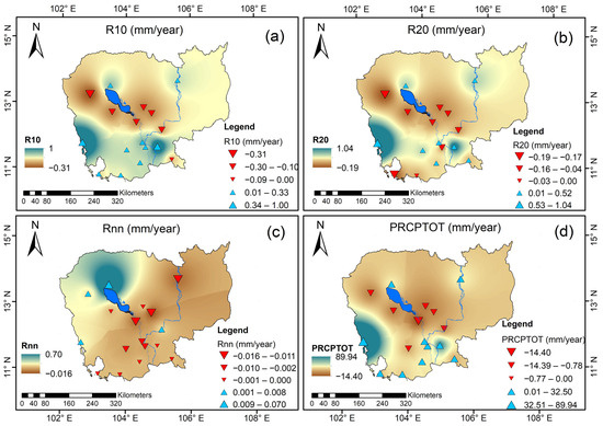 The spatial interpolation of the trends of the extreme rainfall indices in Cambodia: (a) R10, (b) R20, (c) Rnn, and (d) PRCPTOT. The filled red downward and filled blue inverted triangles indicate decreasing and increasing trends, respectively.