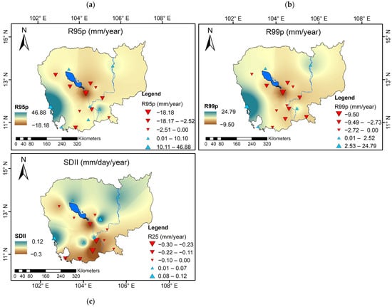 The spatial interpolation of the trends of the extreme rainfall indices in Cambodia: (a) R95p, (b) R99p, and (c) SDII. The filled red downward and filled blue inverted triangles indicate decreasing and increasing trends, respectively.