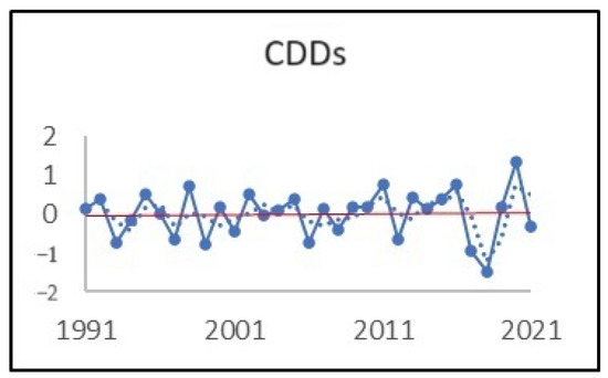 The consequences of global warming on intense precipitation fluctuate depending on the location. For example, it is known that in the past, extreme precipitation occurrences have grown in some tropical regions while decreasing in some subtropical regions [14]. Increased landslides and floods could result from more intense precipitation, which would have disastrous consequences for human society. According to data supplied by the Food and Agriculture Organization of the United Nations (FAO), floods rank among the world’s deadliest natural disasters in terms of the number of fatalities that they have caused since the turn of the 20th century [14]. Most of the previous investigations mainly assessed changes in mean precipitation and rainfall, which are strongly impacted by climate change. Before the effects develop, adaptation and mitigation strategies are needed to deal with the implications of climate change [15]. Studies suggest that additional factors with a negative effect like growing populations, fast development, changes in land use, and shifting precipitation regimes have contributed to a rise in the intensity of droughts throughout time. These elements, in addition to the effects of climate change, have caused a great deal of demand in many nations, leading to major concerns about the security of food and water [16]. For this reason, CDDs are crucial in calculating the quantity of non-consecutive dry days and identifying the periods of prolonged dryness that often precede or follow heavy rainfall events. This information is crucial for predicting droughts, managing water resources, and preparing for the impact of sudden, intense rainfall.