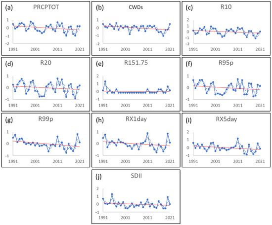 The temporal variation of the decreasing trends for the Tonle Sap region of extreme rainfall indices: (a) PRCPTOT, (b) CWDs, (c) R10, (d) R20, (e) R151.75, (f) R95p, (g) R99p, (h) RX1day, (i) RX5day, and (j) SDII. The solid red line is the linear trend, the solid blue line is the annual variations, and the dotted blue line is the ten-year smoothing average.