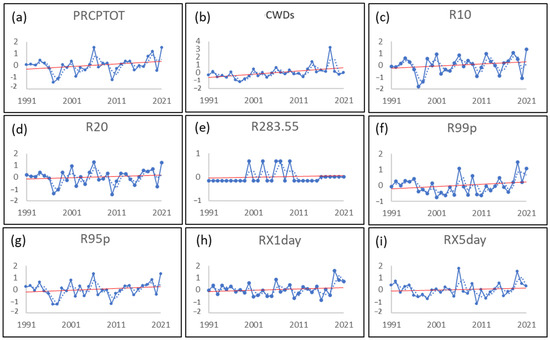 The temporal variation of the increasing trends for the coastal region of extreme rainfall indices: (a) PRCPTOT, (b) CWDs, (c) R10, (d) R20, (e) R283.55, (f) R99p, (g) R95p, (h) RX1day, and (i) RX5day. The solid red line is the linear trend, the solid blue line is the annual variations, and the dotted blue line is the ten-year smoothing average.