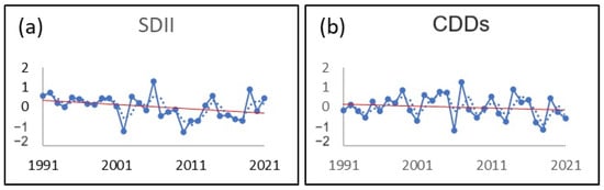 The temporal variation of the decreasing trends for the coastal region of extreme rainfall indices: (a) SDII, and (b) CDDs. The solid red line is the linear trend, the solid blue line is the annual variations, and the dotted blue line is the ten-year smoothing average.