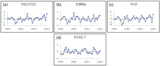 The temporal variation of increasing trends for the Mekong Delta of extreme rainfall indices: (a) PRCPTOT, (b) CWDs, (c) R10, and (d) R140.7. The solid red line is the linear trend, the solid blue line is the annual variations, and the dotted blue line is the ten-year smoothing average.