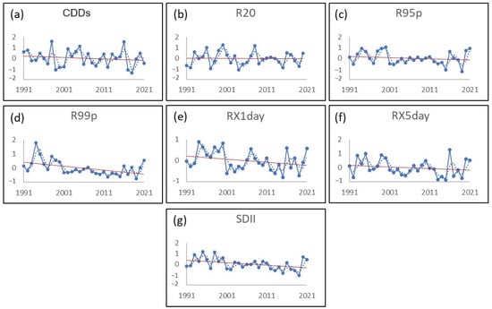 The temporal variation of decreasing trends for the Mekong Delta of extreme rainfall indices: (a) CDDs, (b) R20, (c) R95p, (d) R99p, (e) RX1day, (f) RX5day, and (g) SDII. The solid red line is the linear trend, the solid blue line is the annual variations, and the dotted blue line is the ten-year smoothing average.