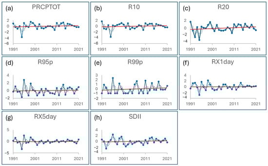 The temporal variation of the increasing trends for the Upper Mekong of extreme rainfall indices: (a) PRCPTOT, (b) R10, (c) R20, (d) R95p, (e) R99p, (f) RX1day, (g) RX5day, and (h) SDII. The solid red line is the linear trend, the solid blue line is the annual variations, and the dotted blue line is the ten-year smoothing average.