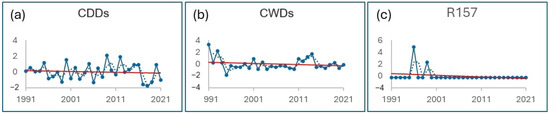 The temporal variation of the decreasing trends for the Upper Mekong of extreme rainfall indices: (a) CDDs, (b) CWDs, and (c) R157. The solid red line is the linear trend, the solid blue line is the annual variations, and the dotted blue line is the ten-year smoothing average.