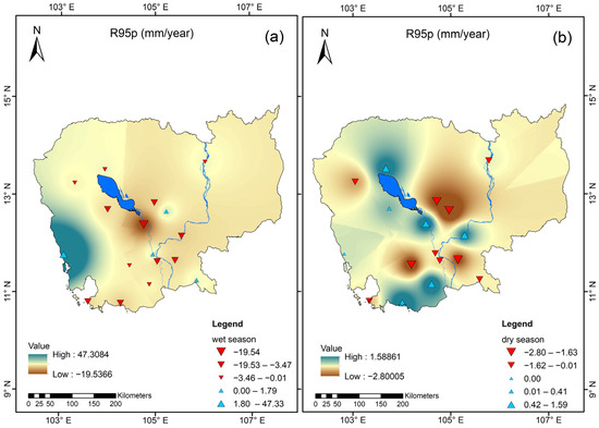 Seasonal extreme rainfall index R95p: (a) wet season; and (b) dry season. The downward red triangle is the negative trend and the upward blue triangle is the positive trend.