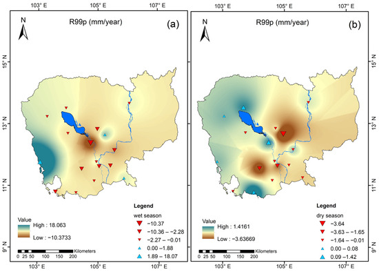 Seasonal extreme rainfall index R99p: (a) wet season; and (b) dry season. The downward red triangle is the negative trend and the upward blue triangle is the positive trend.
