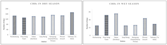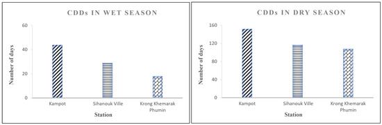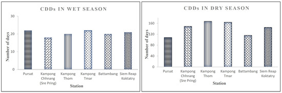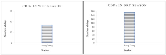 This study also included a detailed investigation of CDDs in seasonal rainfall in each station in addition to an analysis of annual rainfall. This made it possible to comprehend the tremendous precipitation that Cambodia has experienced over the study period in greater detail. The indicators measuring CDDs were computed and assessed using Microsoft Excel for each station during both the wet and dry seasons. In an extreme rainfall analysis, CDDs serve as an index to evaluate extreme precipitation events and to understand the distribution and frequency of drought periods, which can lead to drought conditions and affect water resources, agriculture, and ecosystems.